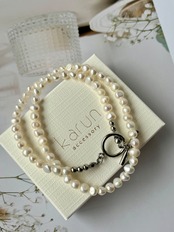 パールは個性のあるバロックにし、金具はサージカルステンレス製のマンテルをつけました。