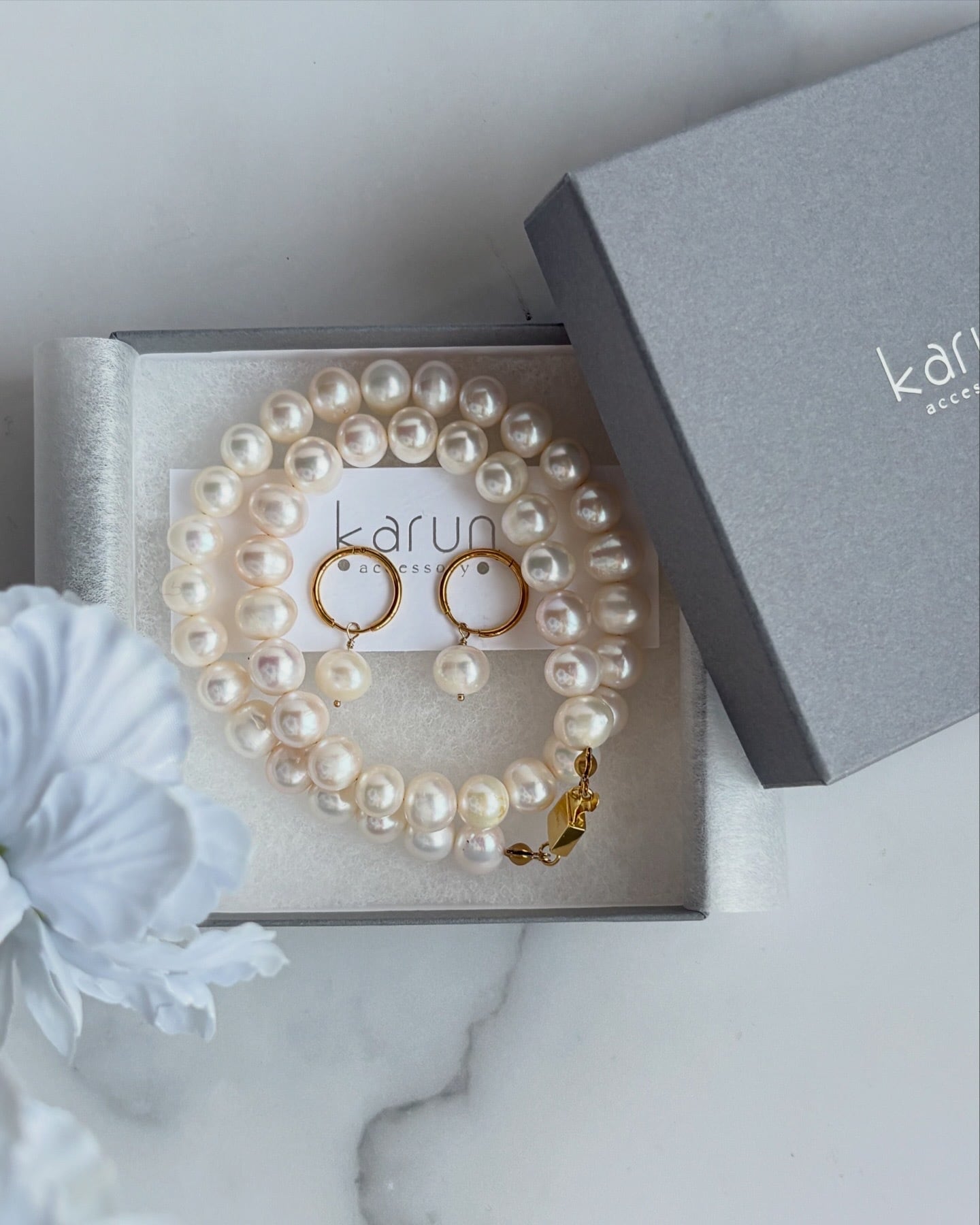 同じパールのフルパールネックレスとセットで身につけていただくと、なにより統一感があって
