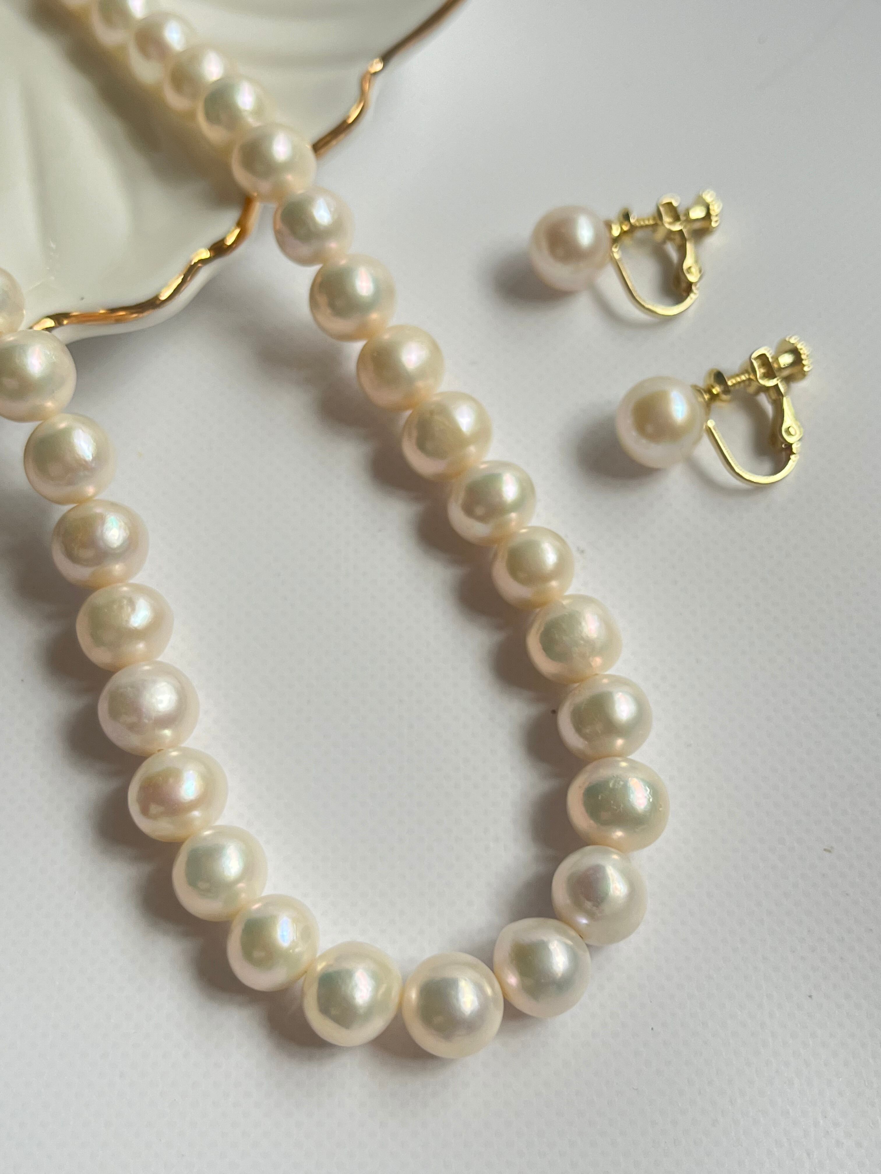 ネックレスは9㎜〜10㎜のセミラウンド〜ポテト型の淡水パールです。